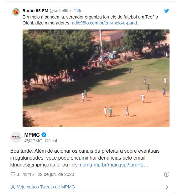 Em resposta ao post no Twiiter da Rádio 98, o Ministério Público do Estado disse que, em situações similares, qualquer pessoa pode realizar denúncias, acionando os canais da prefeitura sobre eventuais irregularidades, ou encaminhando ao email ldnunes@mpmg.mp.br .