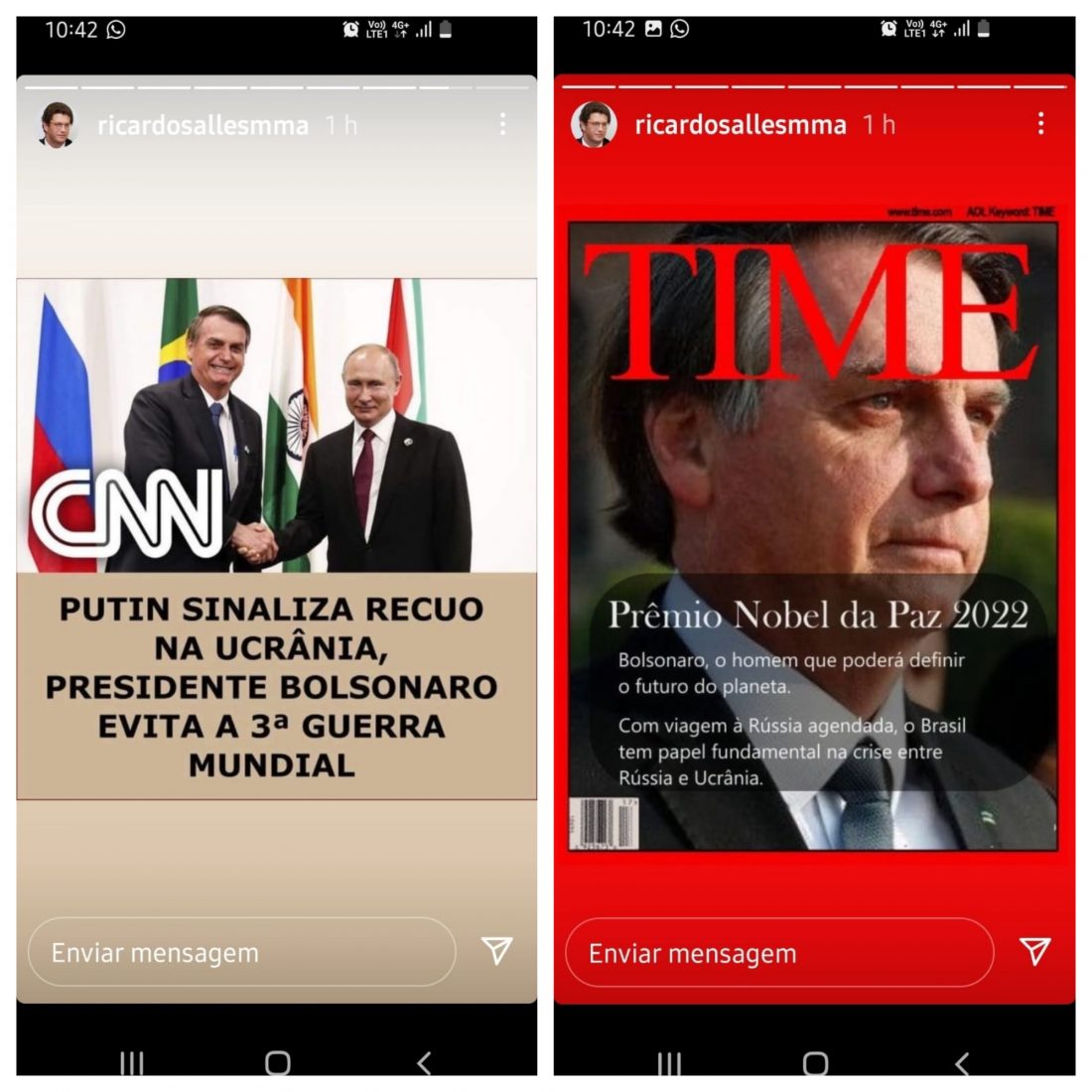 Ex-ministro do Meio Ambiente usou as redes sociais para afirmar que visita do ex-capitão fez Putin ‘recuar’ de invasão na Ucrânia