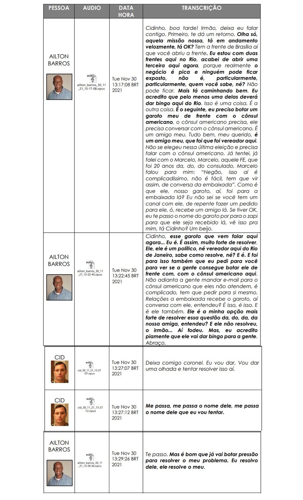 Veja os trechos em que Mauro Cid e Ailton Moraes Barros tratam de um favor para Marcelo Siciliano: