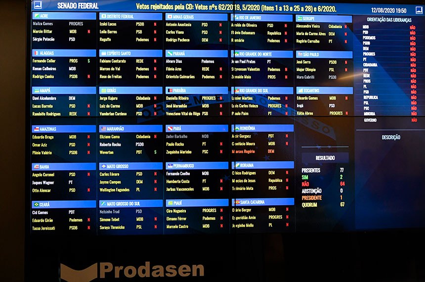 Foram mantidos os vetos 57, 58, 59, 60 e 61, todos de 2019, e os vetos 2, 3, 4, 7, 8 e 9, de 2020.